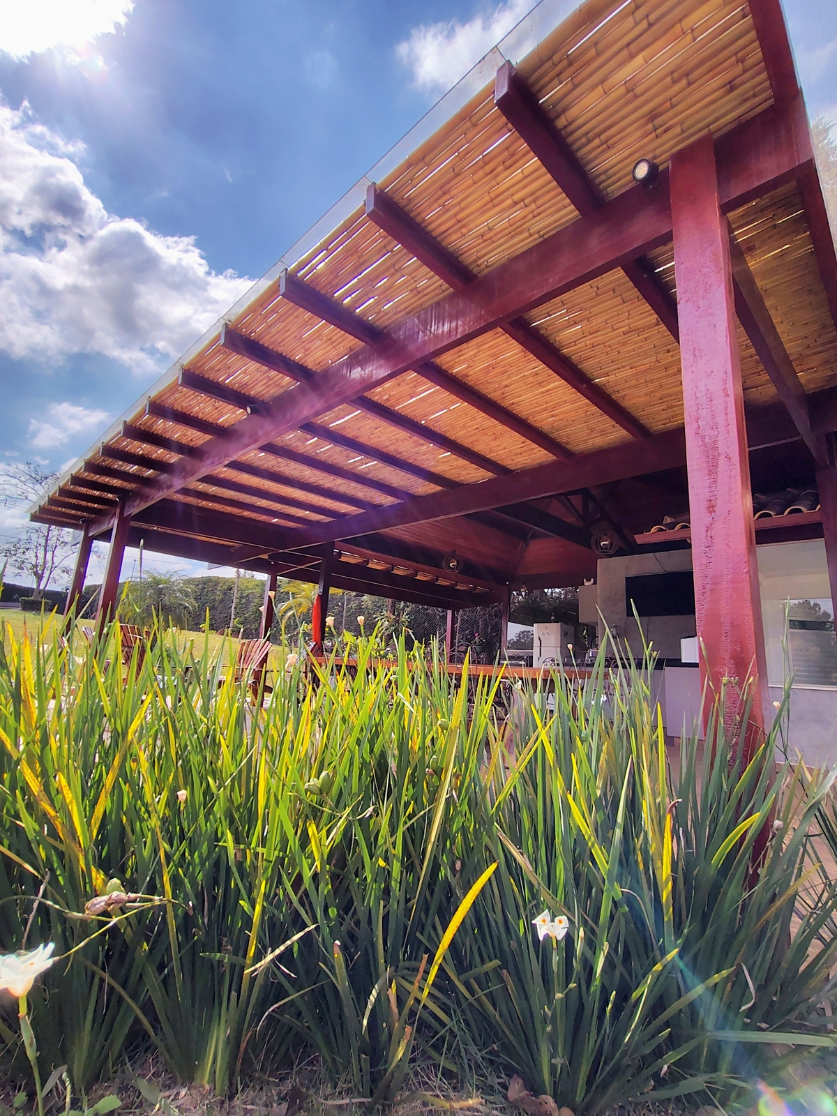 Forro em Bambu Inteiro, trazendo conforto térmico ao ambiente, aumentando a area de uso do pergolado.