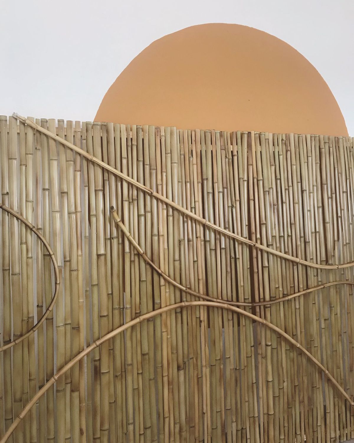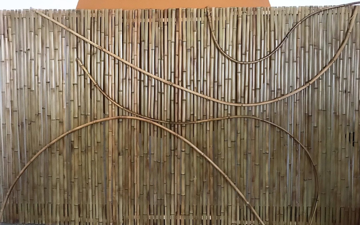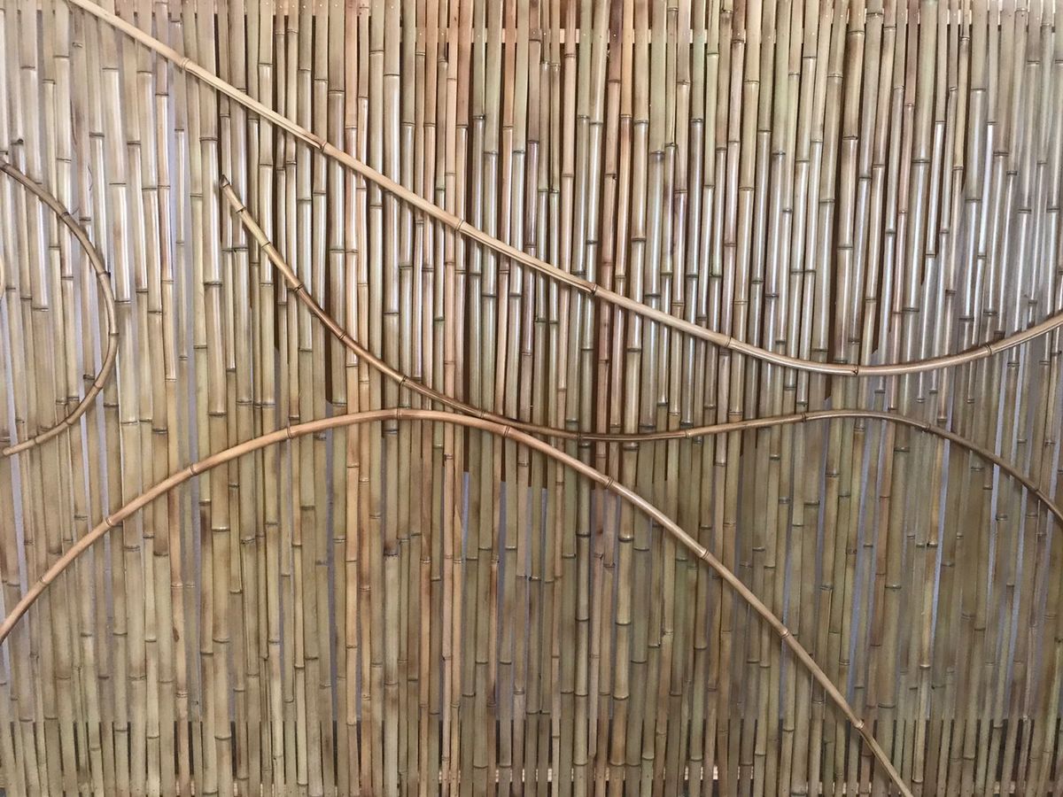Painel de bambu, feito em lascas, para hall de entrada de loja.